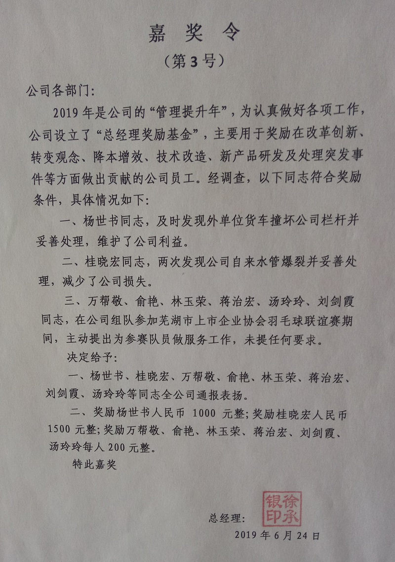 在2019年公司組隊(duì)參加蕪湖市上市企業(yè)協(xié)會(huì)羽毛球聯(lián)誼賽期間,萬(wàn)幫敬等6名員工主動(dòng)提出為參賽隊(duì)員做服務(wù)工作;在日常管理中,桂曉宏兩次發(fā)現(xiàn)廠區(qū)水管爆裂并妥善處理;在生產(chǎn)期間,李平及時(shí)反映了烘干機(jī)出料口部位上方屋面有部分橫條彎曲斷裂存在安全隱患等問(wèn)題;在技術(shù)方案上,方吸云提交了《雷蒙磨運(yùn)行中風(fēng)量、分析機(jī)轉(zhuǎn)速及物料特性之間相互影響的分析》……公司也及時(shí)對(duì)相關(guān)人員給予了幾百元到幾千元的獎(jiǎng)勵(lì)。