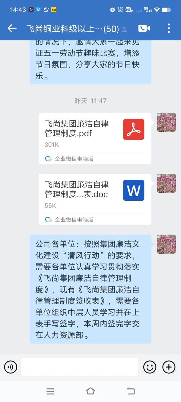 《飛尚集團廉潔自律管理制度》發布后,各成員企業相繼出臺本企業廉潔自律管理制度和各項管理規定,并通過微信工作群廣泛宣傳,不斷健全員工參與機制,充分發揮員工的積極性、創造性,夯實廉潔文化建設的群眾基礎。江西飛尚林產有限公司通過座談會進行深入宣貫,鹽城捷康三氯蔗糖制造有限公司打造了廉潔文化長廊,拓寬了宣貫渠道和方式。