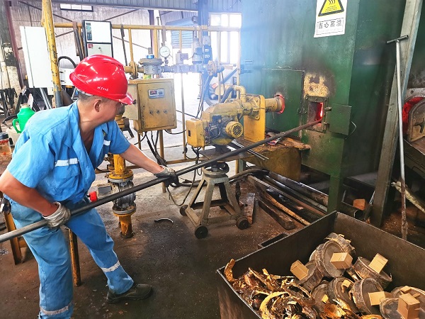 頂著酷暑,走進機器轟鳴、火花四濺的車間,一股股熱浪撲面而來。尤其是黃銅水平連鑄爐和紫銅上引爐的生產(chǎn)現(xiàn)場,高達一千多度的銅水更是令爐臺上的溫度飆至40℃以上。然而工人們并沒有因為高溫而表現(xiàn)出絲毫懈怠。他們穿著整齊的工作服,頭戴安全帽,佩戴棉布手套,各司其職,個個干勁十足。雖然大家在高溫下?lián)]汗如雨,但每個人的臉上都洋溢著堅定的笑容。