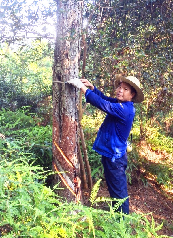 每年夏季是松樹(shù)高產(chǎn)脂旺季,每年的采脂開(kāi)刀從“立夏”開(kāi)始,跨越整個(gè)夏季。每個(gè)采脂工人每年采割林木數(shù)量約6000株,每棵松樹(shù)的采割刀數(shù)要達(dá)到35刀及以上。每個(gè)采脂工人每天采割林木數(shù)量約2000株,有人曾計(jì)算過(guò),采脂工人每天在林地中步行數(shù)量不少于40000步,也就是不少于20000米,這每天步行20000多米啊,可不是在林蔭小道悠閑地散步,不是在花前月下享受著浪漫,而是頭頂烈日,腳踏荊棘。